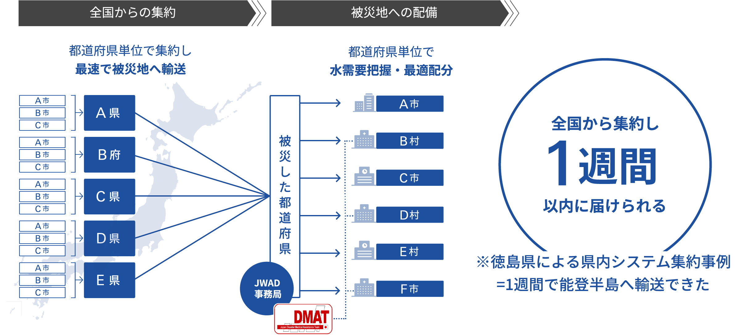 JWADは、自治体・医療機関等が連携する官民協働の中核組織として、広域互助プラットフォームの事務局を担い、平時の体制整備から災害時の現場対応までを一元的に支援します。